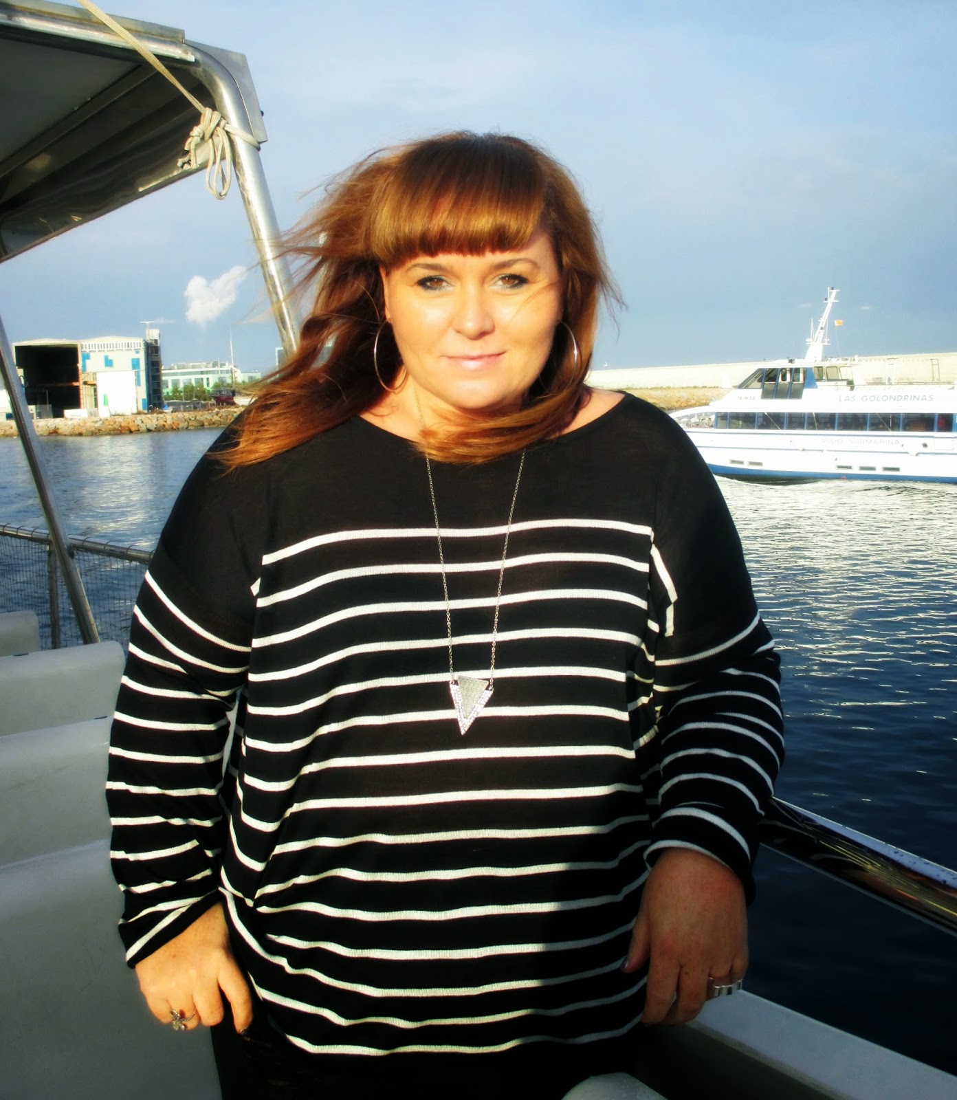 Hoy el outfit es de lo más obvio para un paseo en catamarán por el puerto de Barcelona : un jersey marinero.